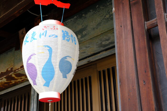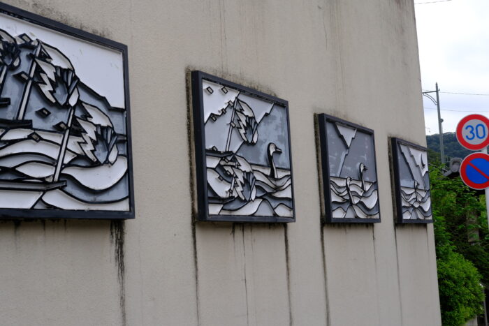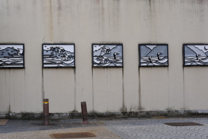 また少し歩くと、壁面に鵜飼のアートが!
