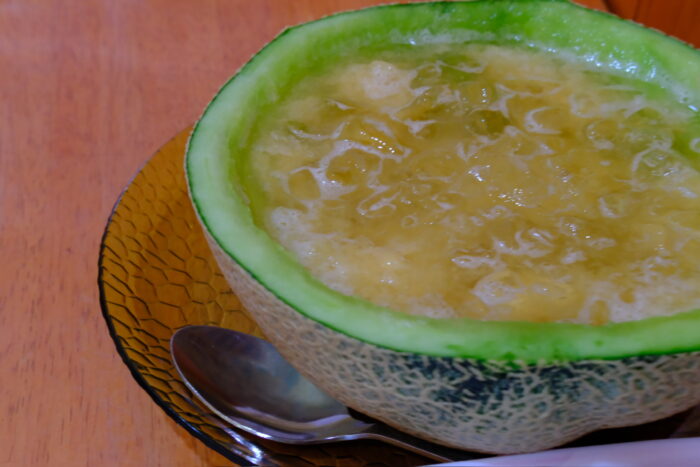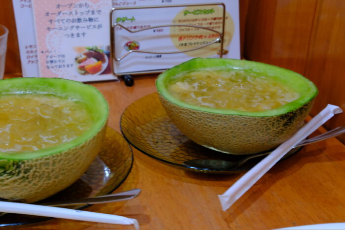 どのテーブルでも注文している人が多かった、メロンジュース。もちろん私たちも注文!