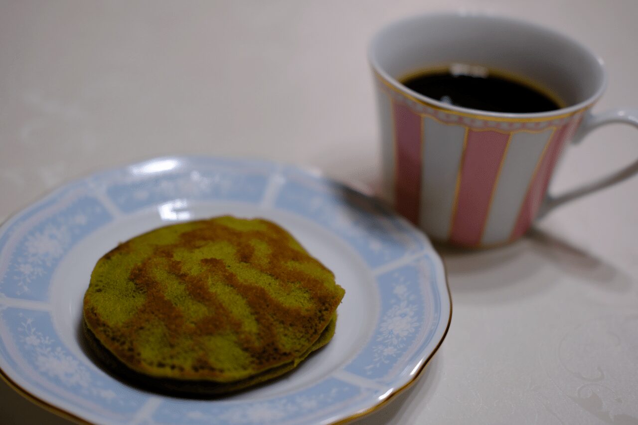 さっそくコーヒーを淹れて、お皿に抹茶どら焼きと鈴カステラを並べて、ふたりでティータイム!