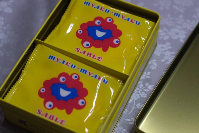 缶の蓋を開けた画像。個包装された黄色いパッケージのサブレ。中心にミャクミャクのイラスト。10枚入り