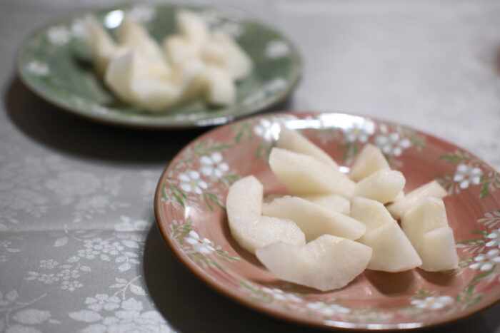 夕食後のデザートに、梨を食べた。梨のみずみずしさと甘さ…!美味しいが止まらない!