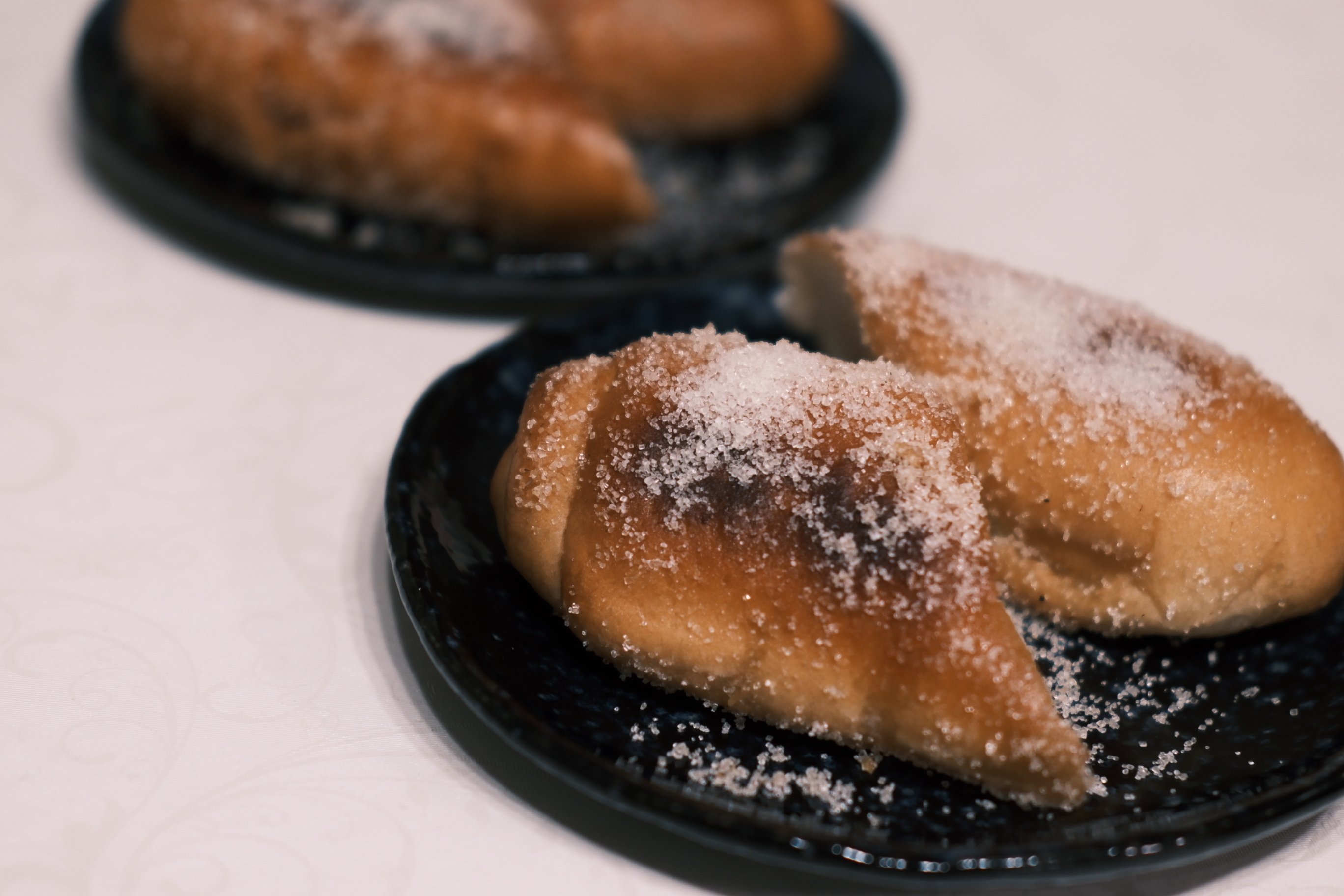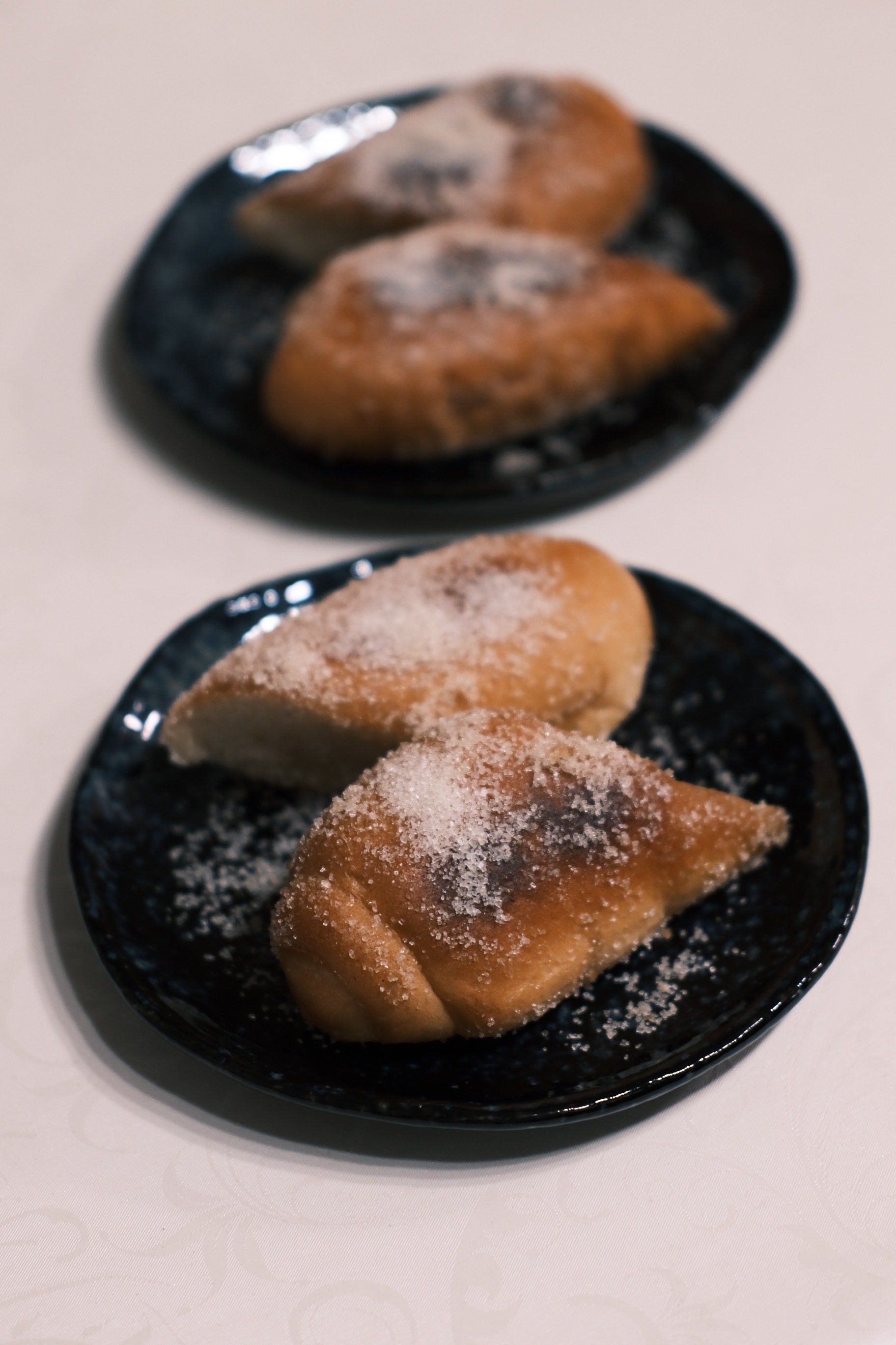 器に盛り付けると、砂糖が儚く、美しく感じた。「星空」という夜空の器に盛り付けた揚げパンは、蝶のようにも見えた。
